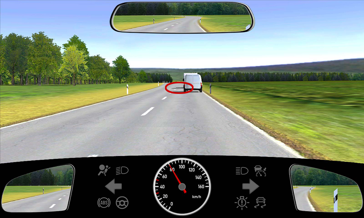 Vor dem Transporter erkennst du ein weiteres Fahrzeug. Es kann sein, dass der Transporter dieses überholen möchte. Warte also mit dem Überholen ab, bis du die Situation besser einschätzen kannst.